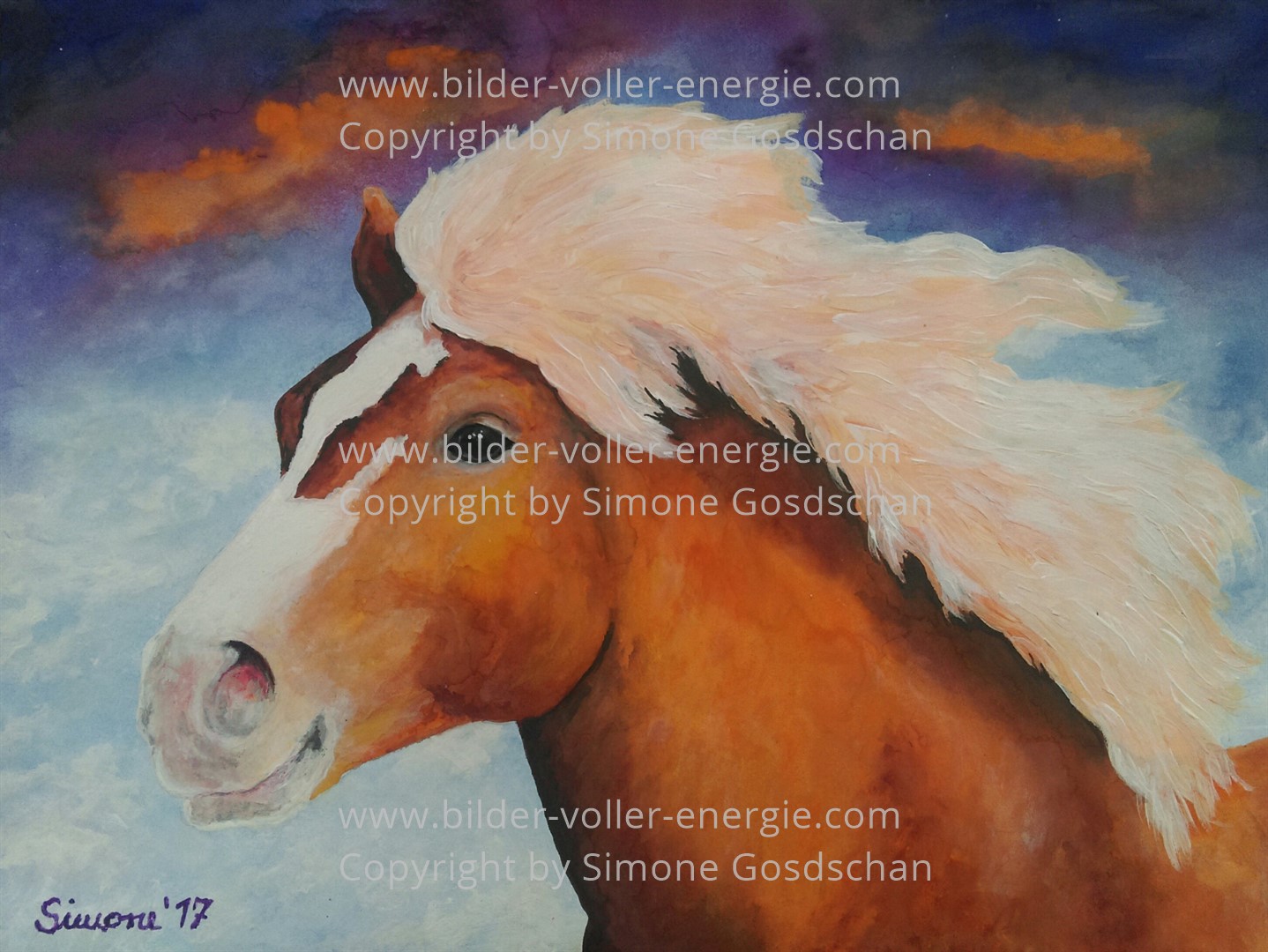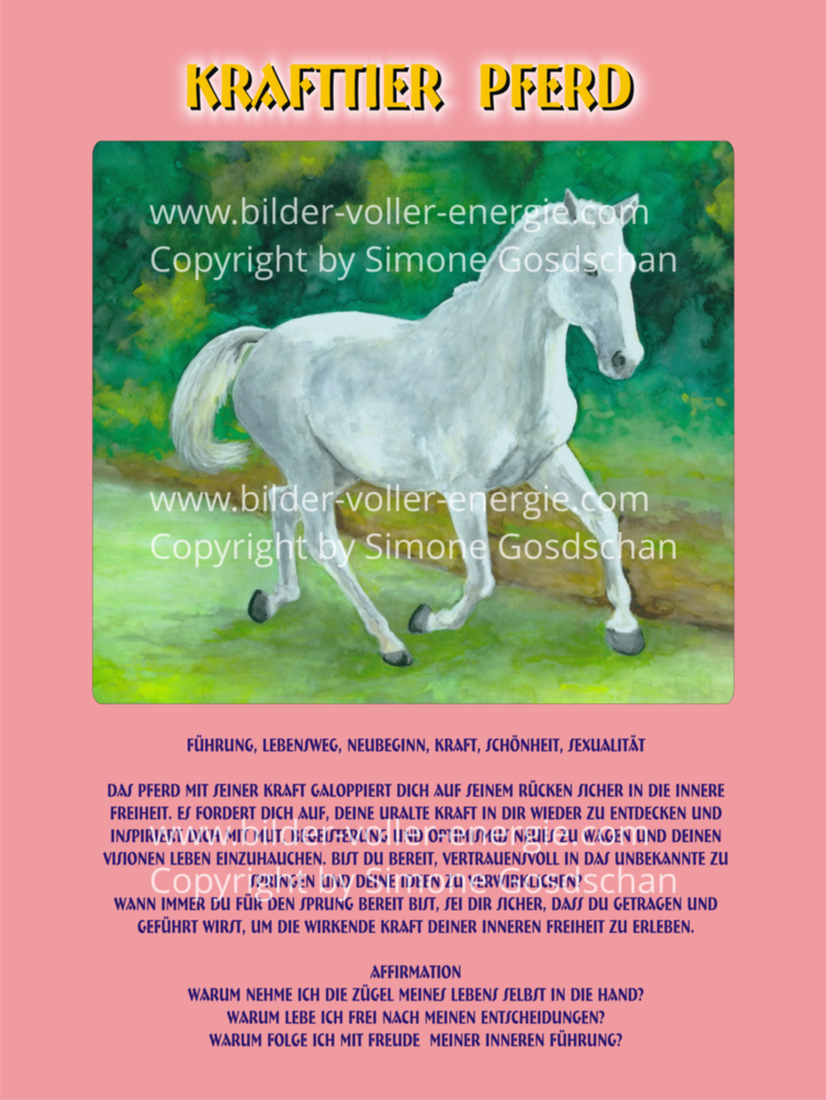 Das Pferd mit seiner Kraft galoppiert dich auf seinem Rücken sicher in die innere Freiheit. Es fordert dich auf, deine uralte Kraft in dir wieder zu entdecken und inspiriert dich mit Mut, Begeisterung und Optimismus Neues zu wagen und deinen Visionen Leben einzuhauchen. Bist du bereit, vertrauensvoll in das Unbekannte zu springen und deine Ideen zu verwirklichen? Wann immer du für den Sprung bereit bist, sei dir sicher, dass du getragen und geführt wirst, um die wirkende Kraft deiner inneren Freiheit zu erleben.